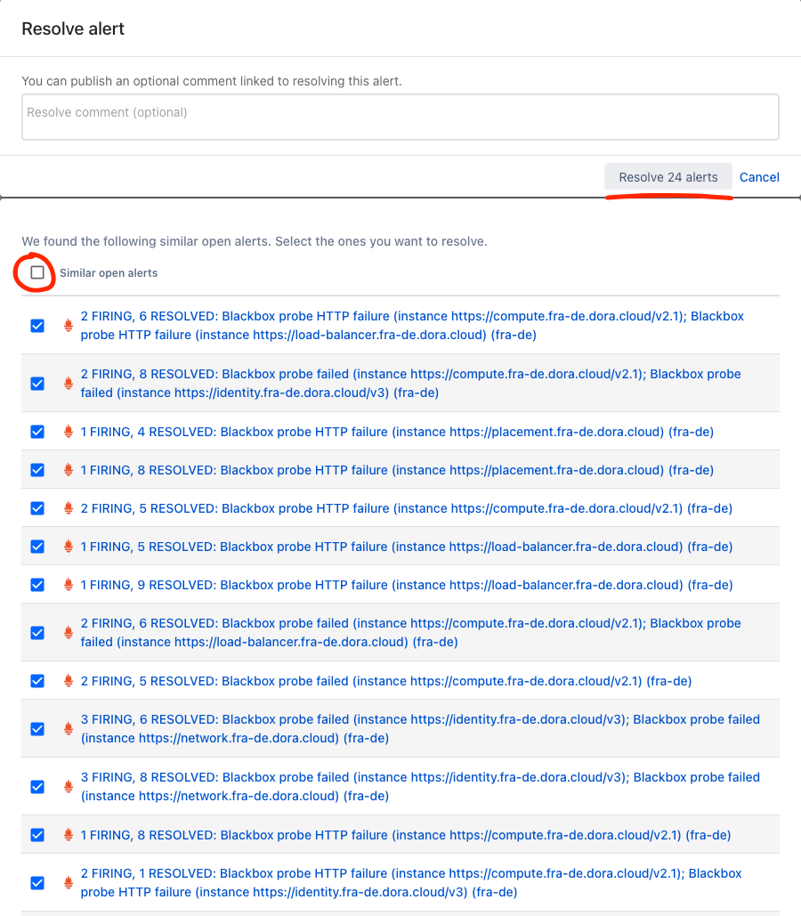 Use the **Select all** option to select all similar alerts (if necessary, use the individual checkbox to remove single alerts that might not exactly match your use-case). Click on **Resolve x alerts** to bulk resolve all selected alerts.