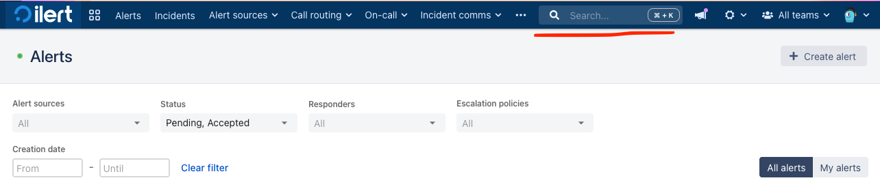 Open the search by clicking on its icon at the top bar or press CTRL/CMD + K. Then enter your desired search term aka alert summary you wish to filter for.