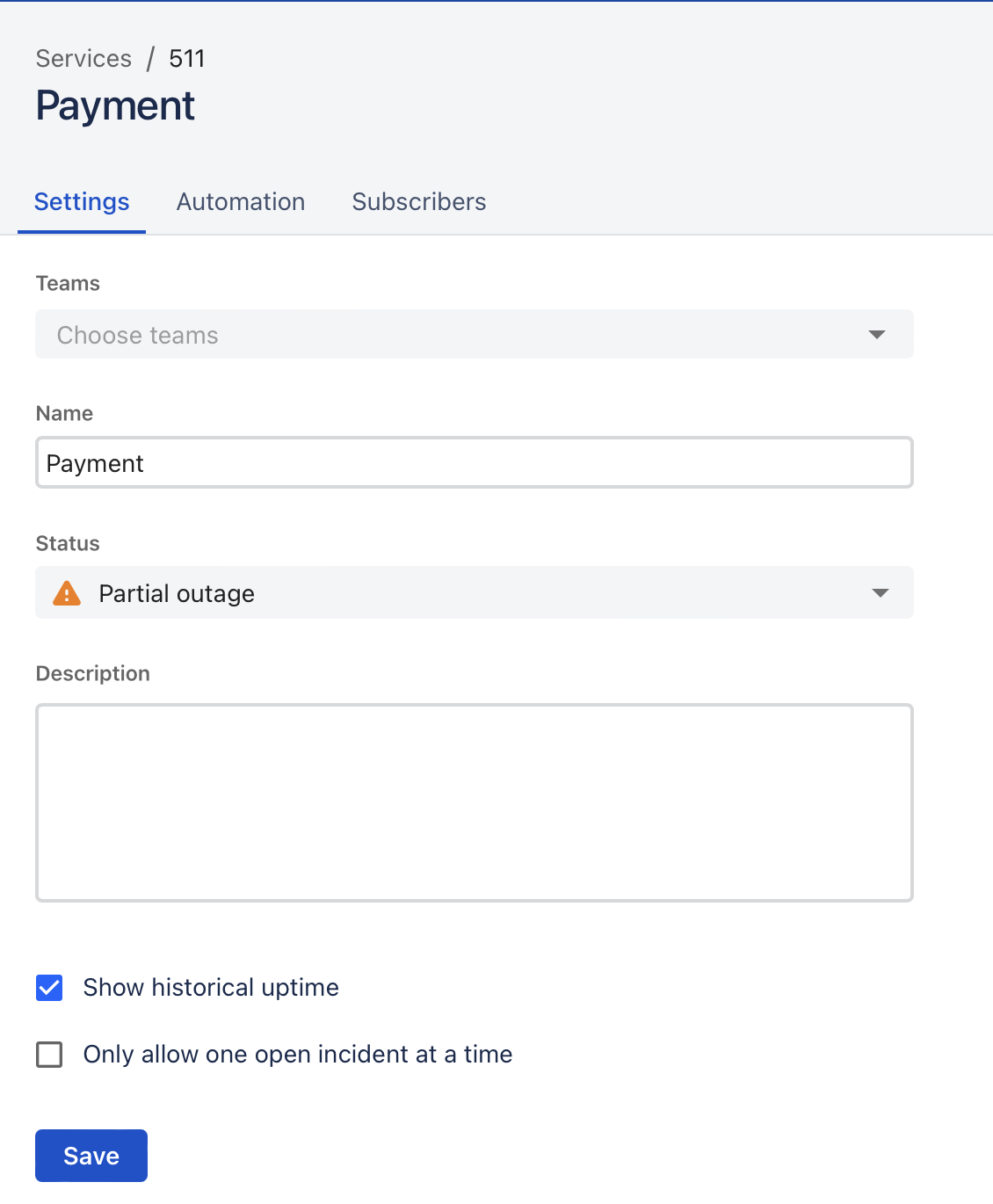 By default, a service's historical uptime is shown and you can choose to hide service uptime on the status page. If you'd like to globally disable historical uptime, thus preventing any status page from displaying the historical uptime, you can do so in the service settings: