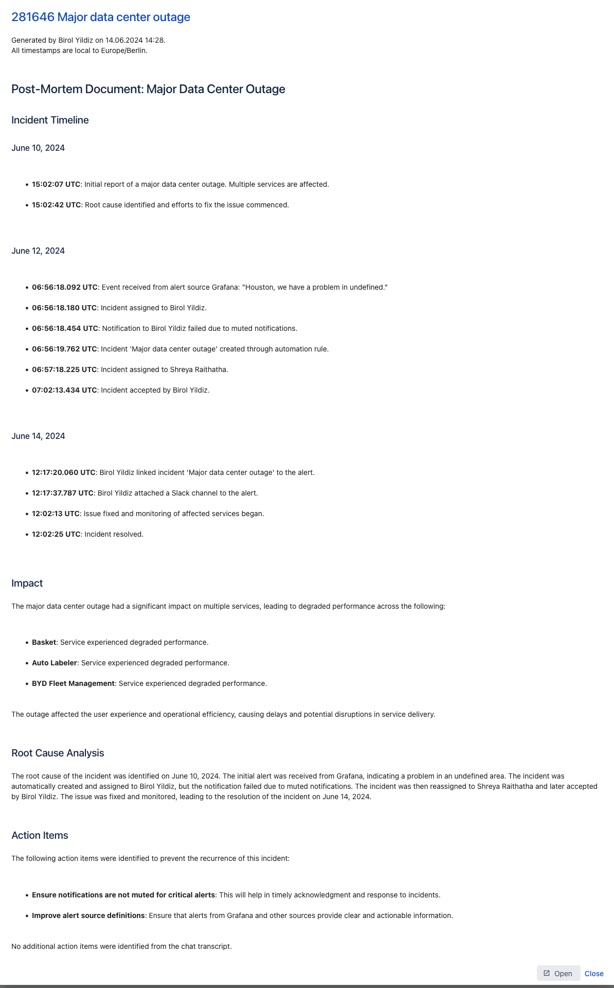 At the bottom right you will find the **Open** option which will contain a link to the raw text file document of your generated postmortem. You will probably want to move this raw version of the document into a shared MS Word or Google Doc for further manual fine-tuning and adjustments before sharing it with colleagues.