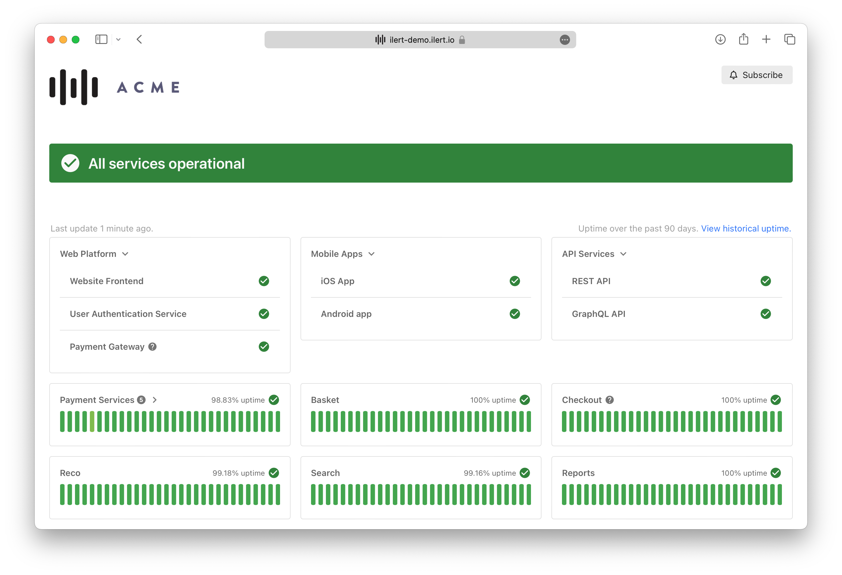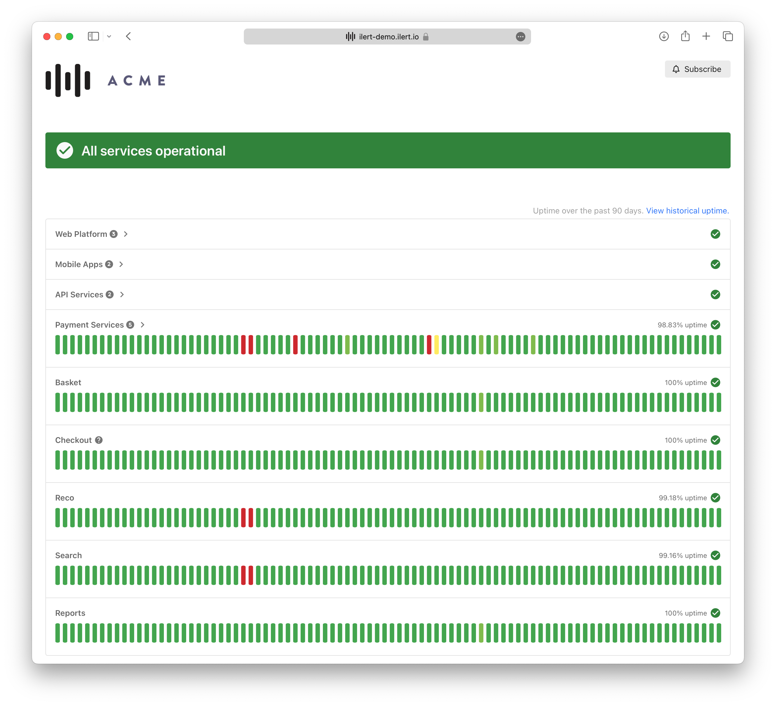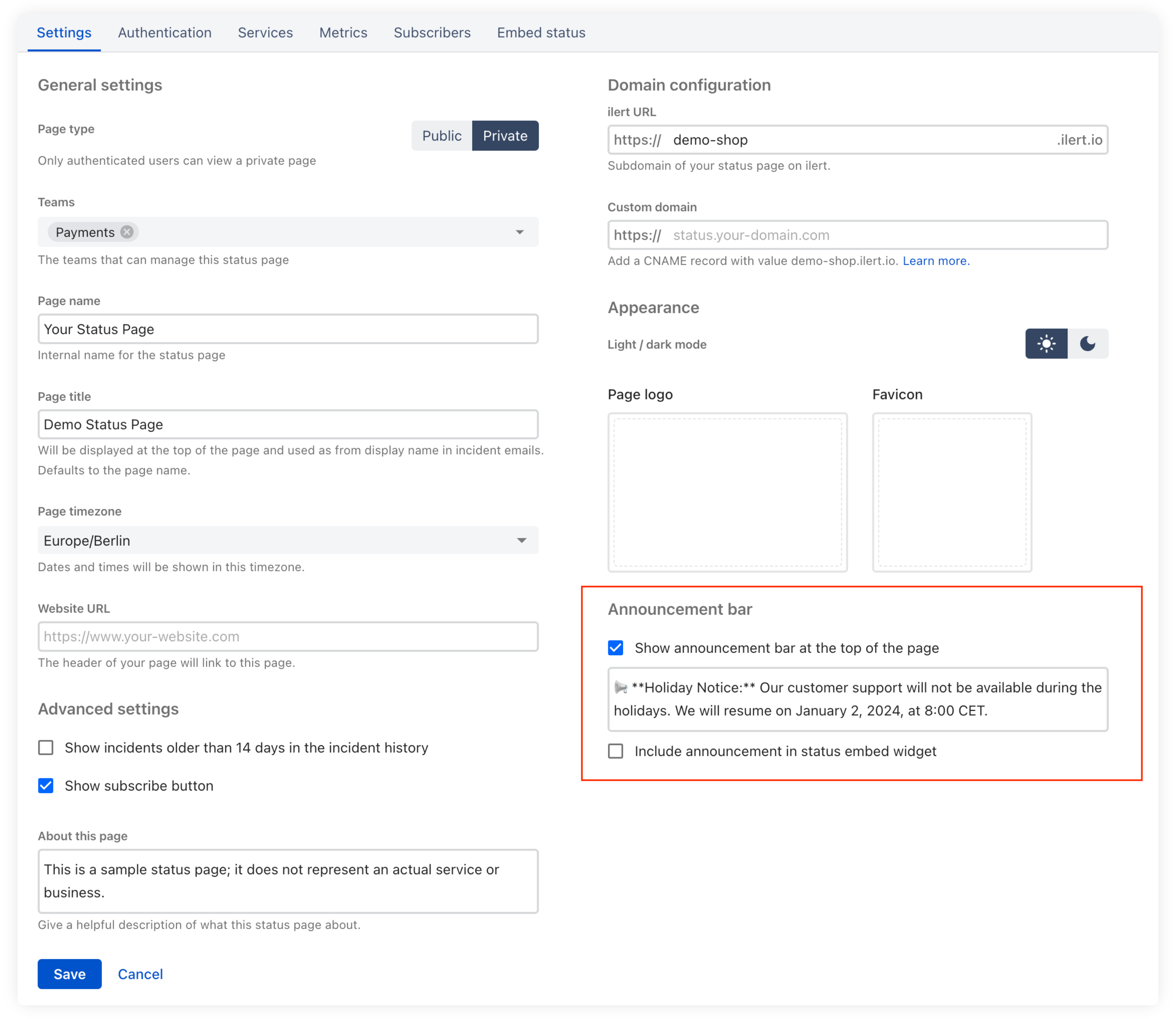 Share essential announcements via your status page. Enable an announcement bar in the status page settings. To make your message more engaging, use simple Markdown and emojis. The announcement bar will be shown at the top of your status page.
