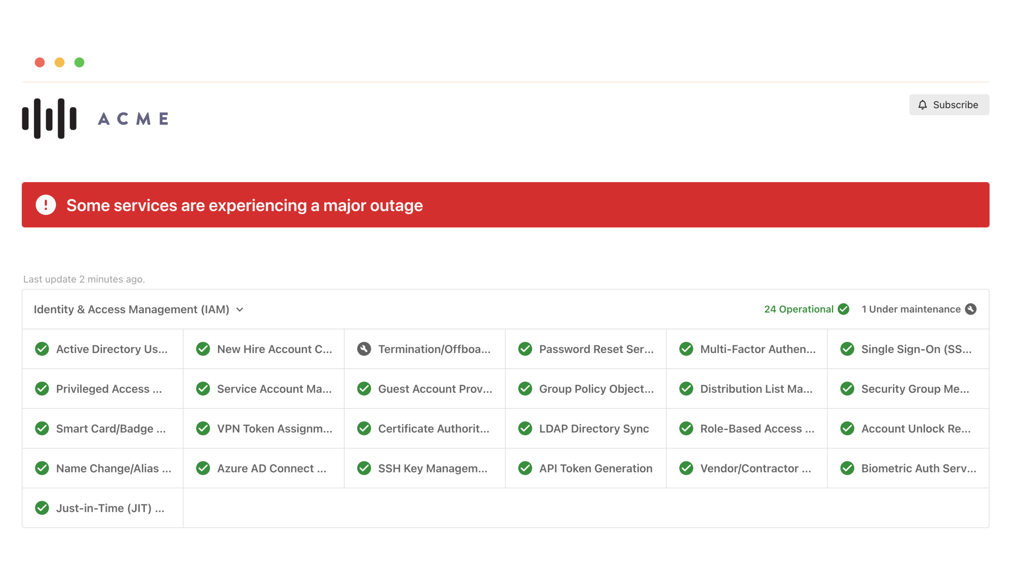 Below is an example service group from our status page. When the service group is collapsed, it shows a combined status and uptime graph. When the service group is expanded, it shows the status and uptime graph for each service individually. The overall status of multiple services in a service group is calculated by taking the status of the service with the highest impact. Similarly, the uptime percentage and outage graph is calculated by combining the outages of all services.