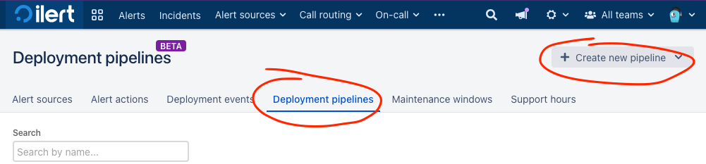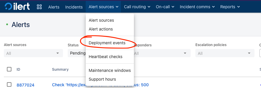 To create the pipeline and generate a new `integrationKey` required to route deployment events when they occur. Head to your ilert account and navigate to **Alert sources -> Deployment events**