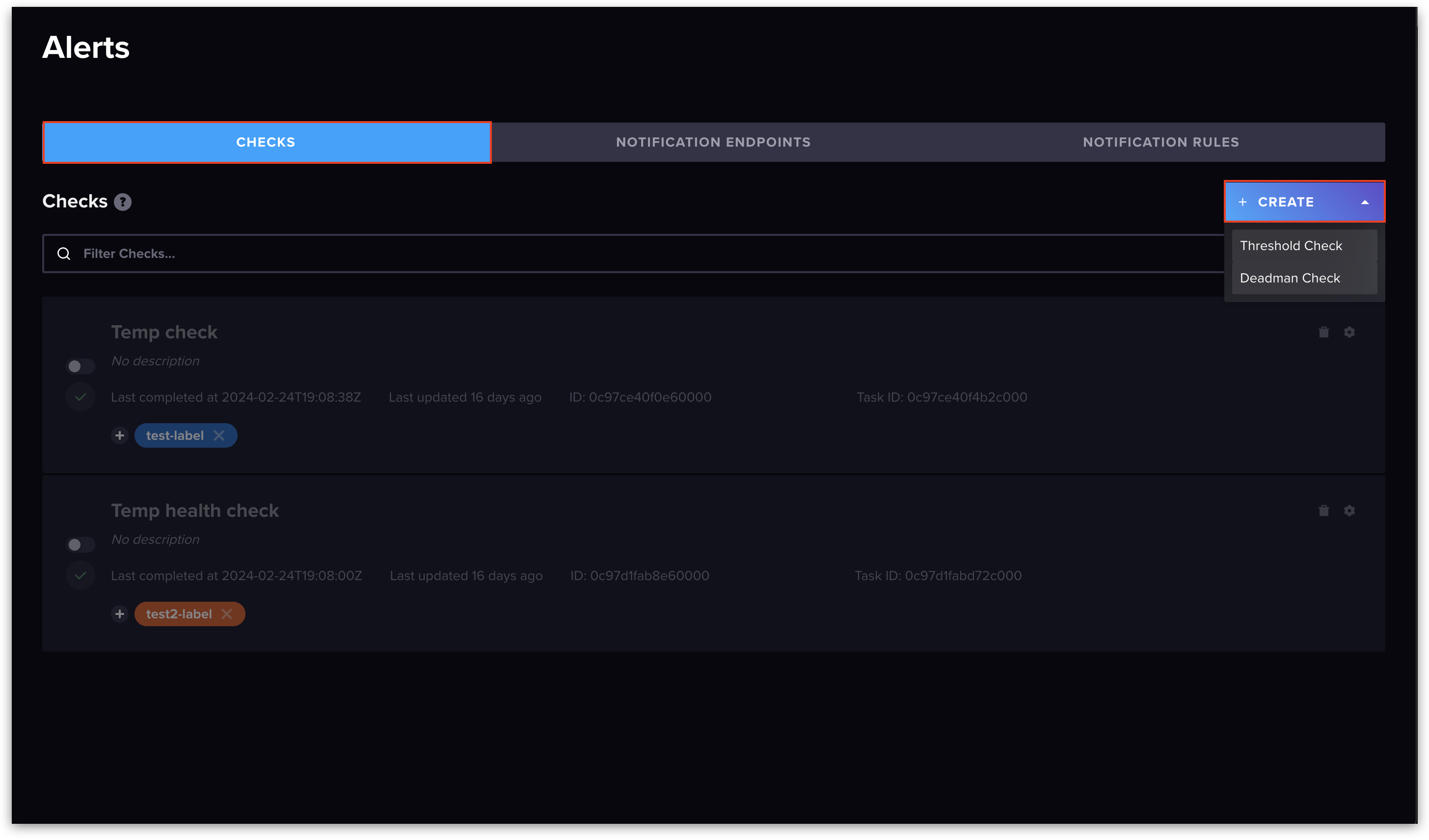 6. Navigate to **Checks -> Create** (this documentation uses threshold checks).