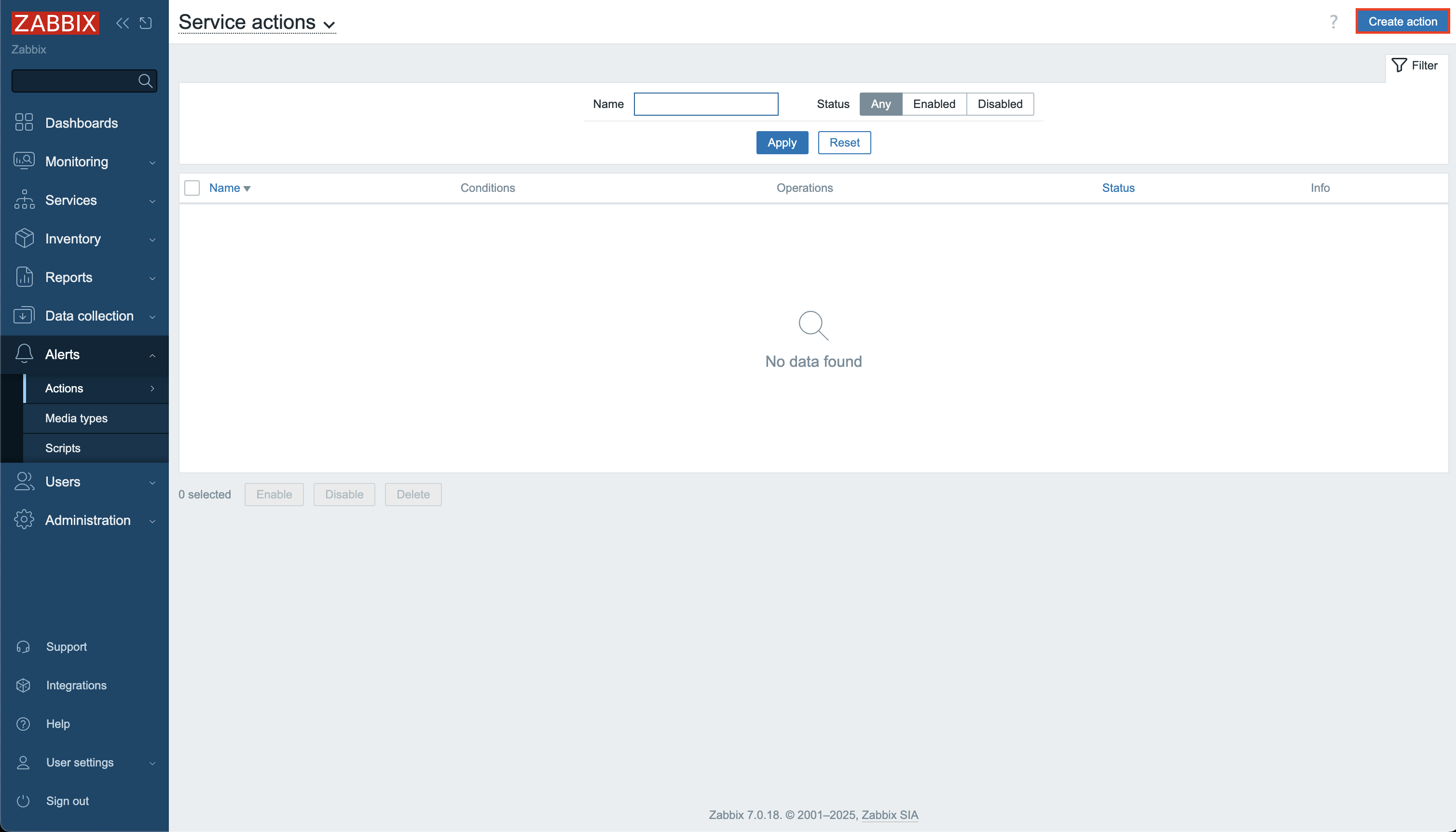 1. Switch to the Configuration → Actions tab and click the Create action button