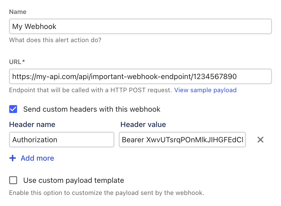 You can add custom HTTP headers to the webhook in the edit view of an alert action.