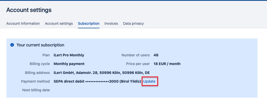 To update the payment method, log in as the account owner and go to Account settings → Subscription and click on Update next to your payment method and enter your new payment information.